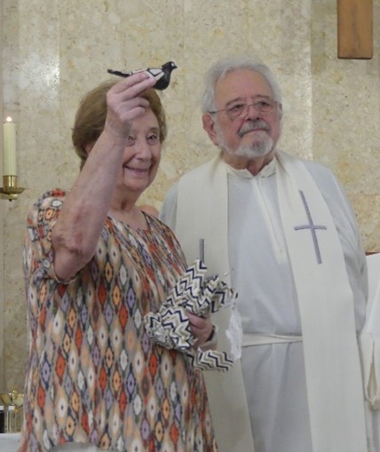 A las doce del mediodía comienza la Eucaristía, presidida por José Luis Molina, acompañado por los otros tres presbíteros mencionados al principio. Toda ella jalonada por una vivencia plena de todos, con evidentes signos de acción de gracias que, en múltiples ocasiones, se plasmaron por parte de unos y otros. A destacar la acción de sinodalidad ofrecida por José Luis al invitar a Elisa a realizar en el momento de la Liturgia de la Palabra, la proclamación del Evangelio. En la homilia José Luis,  resalta la vida de Elisa, tan cercana y acorde con el Evangelio proclamado, posteriormente facilitó en la misma línea de sinodalidad la intervención de cuantos quisieron expresar sus peticiones y/o acciones de gracias por cuanto desde su interior sentían fuertemente. A destacar también el acompañamiento del Coro “Virolai” que se inició en  nuestra Iglesia, y que ya en la actualidad son profesionales conocidos en toda Europa. En los momentos propios de la Liturgia intervino, destacando durante el ofertorio “Mostra te esse Matre”, canto-oración muy propio de SMR, dando una solemnidad   que   todos   agradecieron.   Antes   del   ofertorio,  José  Luis  dio  a  Elisa,  como  su  regalo   propio   que   le   haga   recordar   aquellos momentos,  una  paloma,  invitándola  igualmente  a que  lo   ofreciese en el altar  en  su  momento,  como  así  hizo  Elisa.Terminó esta sentida Eucaristía con el canto a la virgen María, de la “Salve Marinera”, entonada magistralmente por el citado Coro. Las lecturas, elegidas para esta ocasión por Elisa, fueron las que ya desde sus comienzos en la Congregación lleva grabadas en su interior, especialmente tanto la del profeta Jeremías en su diálogo con Dios “Me sedujiste, Señor, y me dejé seducir”, como la del evangelista Mateo que a nosotros, a todos, en todo tiempo y lugar nos invita a no estar preocupados por qué vamos a comer ni qué ropa nos pondremos, “¿No es más la vida que el alimento y el cuerpo más que la ropa? Miren como las aves del  cielo no siembran, ni cosechan, ni guardan en sus bodegas, y el Padre celestial, Padre de ustedes, las alimenta. ¿No valen ustedes más que las aves?”