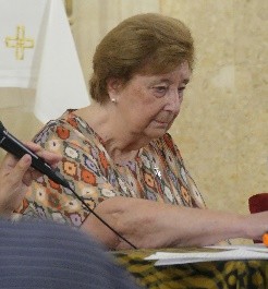 Seguidamente toma la palabra Elisa, agradeciendo evidentemente emocionada, el homenaje que se le hace y que lo asume desde su cercanía y humildad que le caracteriza. En sus palabras no deja de señalar a tres personas que le marcaron su trayectoria, tanto personal como catequéticamente hablando: Don Rafael Bellido Caro, primer obispo de Asidonia-Jerez, Paco González, presbítero de la parroquia de San José Obrero de El Puerto de Santa María, con el que tanto trabajo conjunto realizó, y su compañera de tanto camino, su Hermana  Carmen Cortés. Ellos tres inolvidables en su caminar. El finalizar su intervención se vio culminado con un grandioso aplauso que se dilató varios minutos por parte de cuantos asistían al acto.