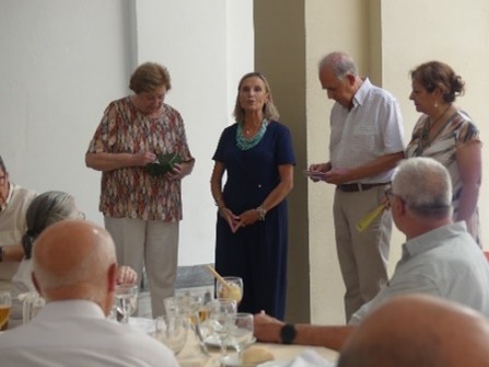 Ya sobre las 14’00 horas, nos trasladamos todos de la Casa de María Reparadora al Seminario diocesano, en cuyo patio central, en las zonas laterales que nos mantenían bajo techo al amparo de ese sol que aún no nos es agradable en esta época del año en nuestro entorno, nos fuimos acoplando de ocho en ocho, de forma aleatoria, alrededor de mesas redondas distribuidas alrededor de dicho patio, comenzando a disfrutar de un muy buen almuerzo que se dilató hasta pasadas casi dos horas.